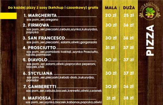 W chwili obecnej oferujemy ponad dwadzieścia różnych rodzajów pizzy, w tym możliwość komponowania pizzy z dowolnymi, dostępnymi składnikami. Nasza pizza podawana jest w dwóch rozmiarach:mała: 28 cm, duża: 36 cm.